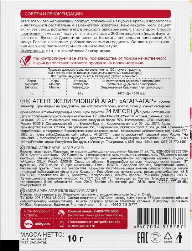 Качественный агар не имеет вкуса и запаха. При кипячении образует прозрачный раствор. При застывании становится чистым и крепким гелем.