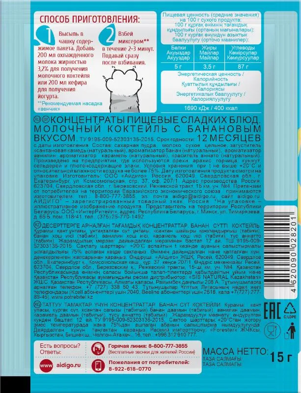 С этой смесью легко приготовить 1 порцию ароматного молочного коктейля - просто добавьте содержимое упаковки в 200 мл молока или кефира, взбейте в шейкере или блендере около 2-3 минут. Все готово!