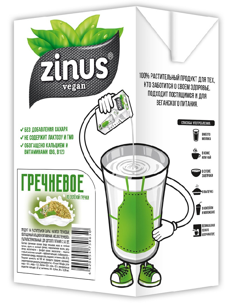 Растительное молоко из зеленой гречки Zinus — это 100% растительный продукт без добавления сахара, красителей и консервантов. Подойдет для кофе, чая, в качестве основы коктейлей, в выпечку, для хлопьев на завтрак. Зелёная гречка богата витаминами группы В, в ней много фолиевой кислоты, железа, кальция, калия, цинка, также содержит в большом количестве рутин. Гречневое молоко подойдет вегетарианцам, постящимся, людям с непереносимостью лактозы и всем, кто следит за своим питанием.