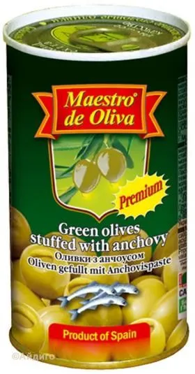 Оливки могут входить в рацион человека любого возраста. Употребление плодов оливкового дерева является профилактикой заболеваний сердца и сосудов, язвы желудка и заболеваний печени. Оливки поступают в продажу только после кулинарной обработки, и это не случайно. Свежие оливки несъедобны из-за горечи и жесткости. Показателями качества консервированных оливок является одинаковый размер плодов, гладкая поверхность оливок. Фаршированы анчоусами. Объем: 300 г Торговая марка: Maestro de Oliva Страна: Испания