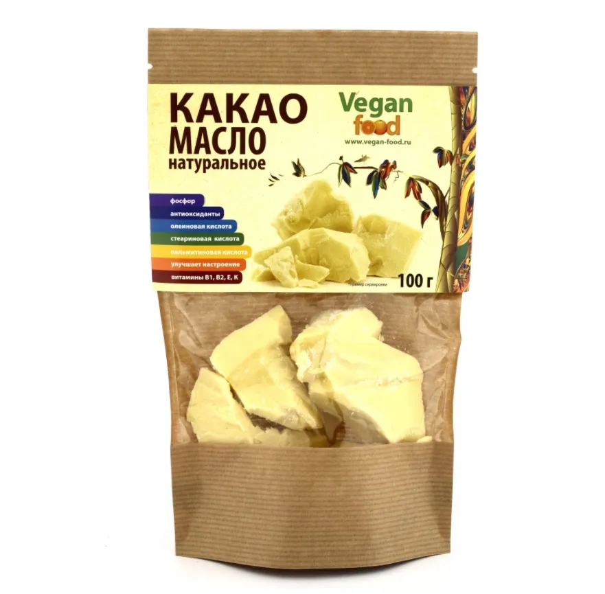 100% какао-масло натуральное нерафинированное, недезодорированное (extra virgin).