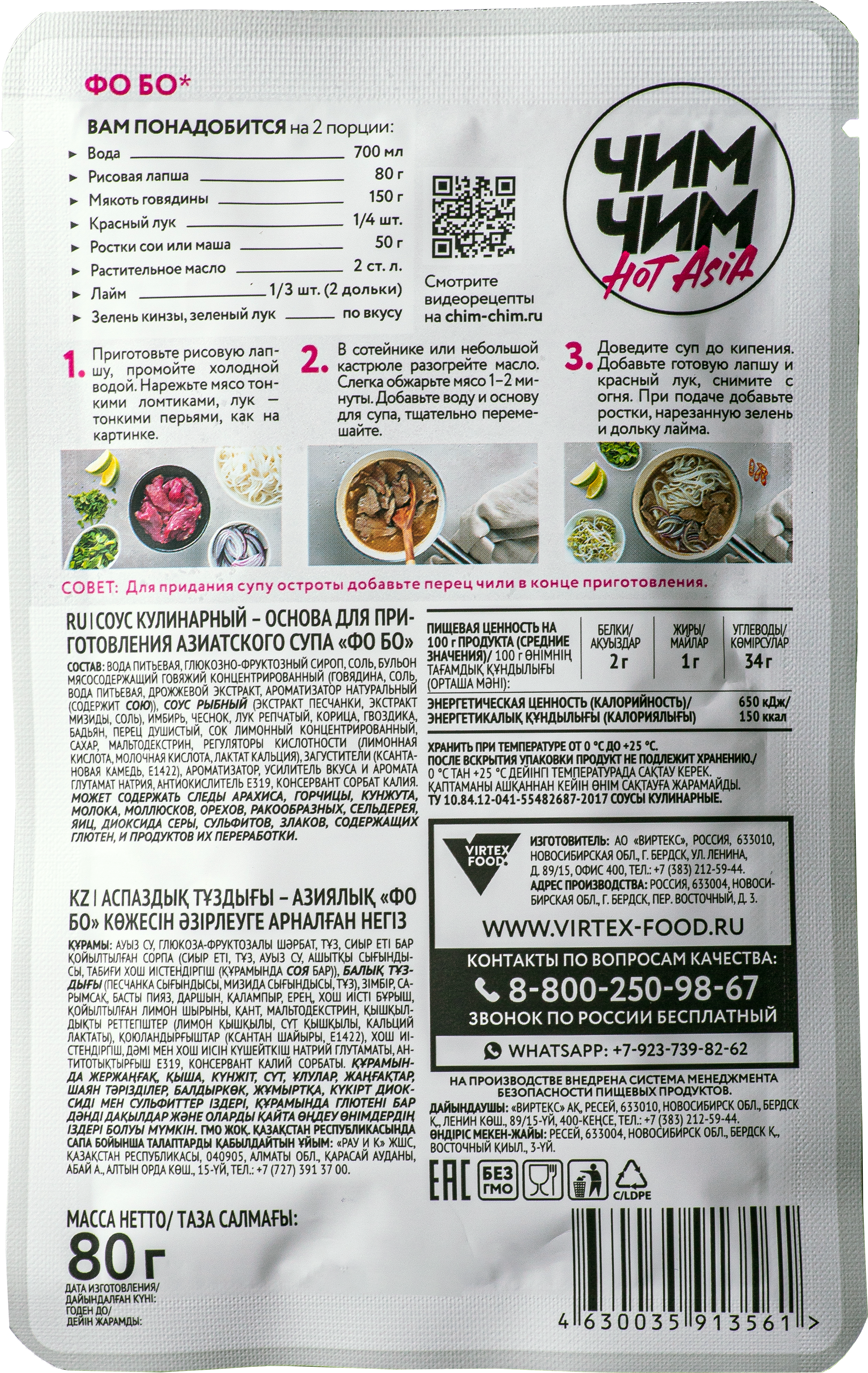 Состав: Вода питьевая, глюкозно-фруктозный сироп, соль, бульон мясосодержащий говяжий концентрированный (говядина, соль, вода питьевая, дрожжевой экстракт, ароматизатор натуральный (содержит сою)), соус рыбный (экстракт песчанки, экстракт мизиды, соль), имбирь, чеснок, лук репчатый, корица, гвоздика, бадьян, перец душистый, сок лимонный концентрированный, сахар, мальтодекстрин, регуляторы кислотности (лимонная кислота, молочная кислота, лактат кальция), загустители (ксантановая камедь, Е1422), ароматизатор, усилитель вкуса и аромата глутамат натрия, антиокислитель Е319, консервант сорбат калия. Может содержать следы арахиса, горчицы, кунжута, молока, моллюсков, орехов, ракообразных, сельдерея, яиц, диоксида серы, сульфитов, злаков, содержащих глютен, и продуктов их переработки.