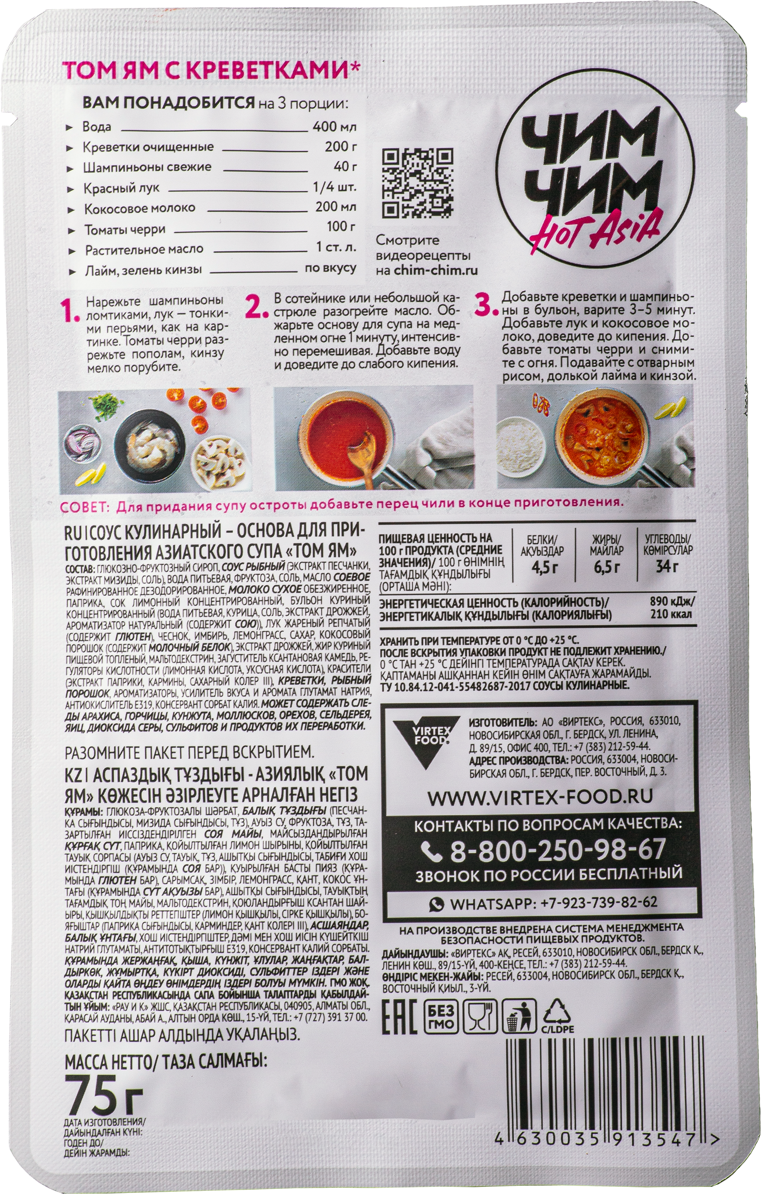 Состав: Глюкозно-фруктозный сироп, соус рыбный (экстракт песчанки, экстракт мизиды, соль), вода питьевая, фруктоза, соль, масло соевое рафинированное дезодорированное, молоко сухое обезжиренное, паприка, сок лимонный концентрированный, бульон куриный концентрированный (вода питьевая, курица, соль, экстракт дрожжей, ароматизатор натуральный (содержит сою)), лук жареный репчатый (содержит глютен), чеснок, имбирь, лемонграсс, сахар, кокосовый порошок (содержит молочный белок), экстракт дрожжей, жир куриный пищевой топленый, мальтодекстрин, загуститель ксантановая камедь, регуляторы кислотности (лимонная кислота, уксусная кислота), красители (экстракт паприки, кармины, сахарный колер III), креветки, рыбный порошок, ароматизаторы, усилитель вкуса и аромата глутамат натрия, антиокислитель Е319, консервант сорбат калия. Может содержать следы арахиса, горчицы, кунжута, моллюсков, орехов, сельдерея, яиц, диоксида серы, сульфитов и продуктов их переработки.