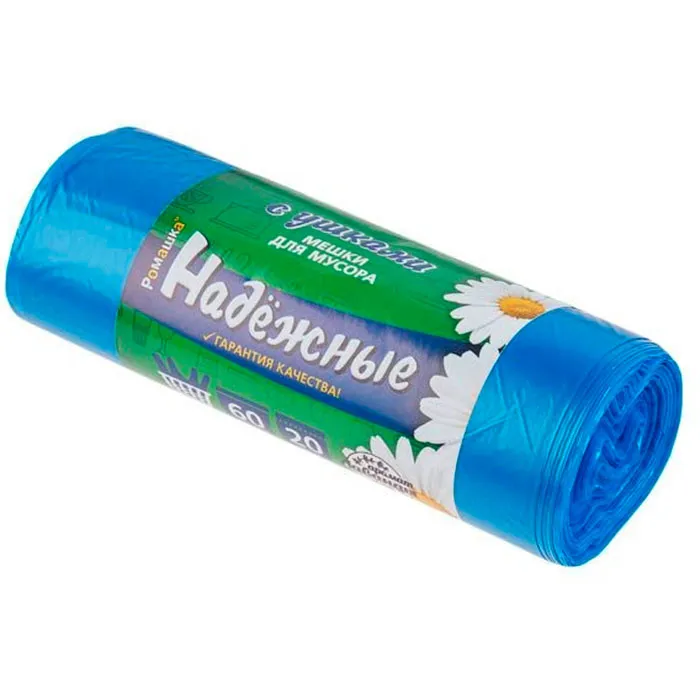 Пакеты для мусора Ромашка 60л 20шт Надежные "с ушками" синие, 15мкм