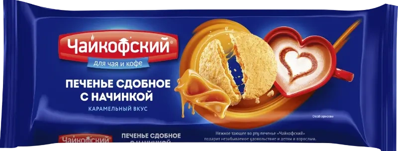 Чайкофский Печенье сдобное с начинкой с карамельным вкусом - нежное и аппетитное печенье с мягкой основой, которое подарит вам настоящее удовольствие благодаря своей уникальной комбинации вкусов.