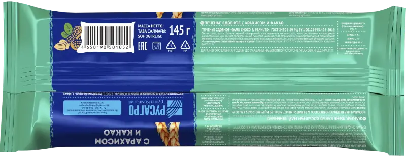 Состав: сахар, арахис бланшированный (обжаренный), мука пшеничная высшего сорта, масло растительное, какао-порошок алкализованный, мука овсяная, продукты яичные, сыворотка молочная сухая, разрыхлители (гидрокарбонат натрия, гидрокарбонат аммония), эмульгатор: лецитин рапсовый, соль йодированная (содержит йодат калия, агент антислеживающий: ферроцианид калия). Может содержать следы орехов, кунжута и корицы.
