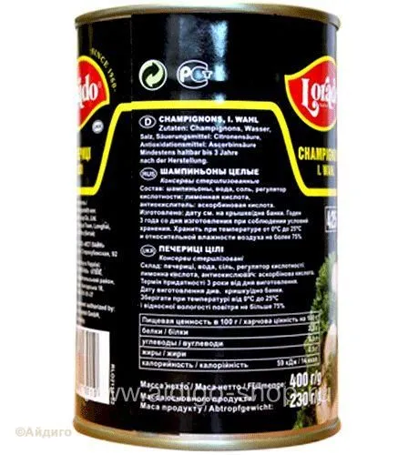 В шампиньонах очень низкое содержание соли, а содержание тдиетической клетчатки 1г на 100г. Эти грибы обладают лечебными свойствами. Сок шампиньонов является активнын бакрерицибным веществом, эти вкусные грибы эффективно очищают наш организм, выводя из него соли тяжелых металлов. Шампиньоны Lorado - свежие, целые грибочки, помещенные в рассол.
