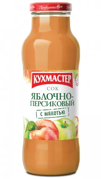 - Сок Яблочно-персиковый с мякотью в стеклянной бутылке Кухмастер