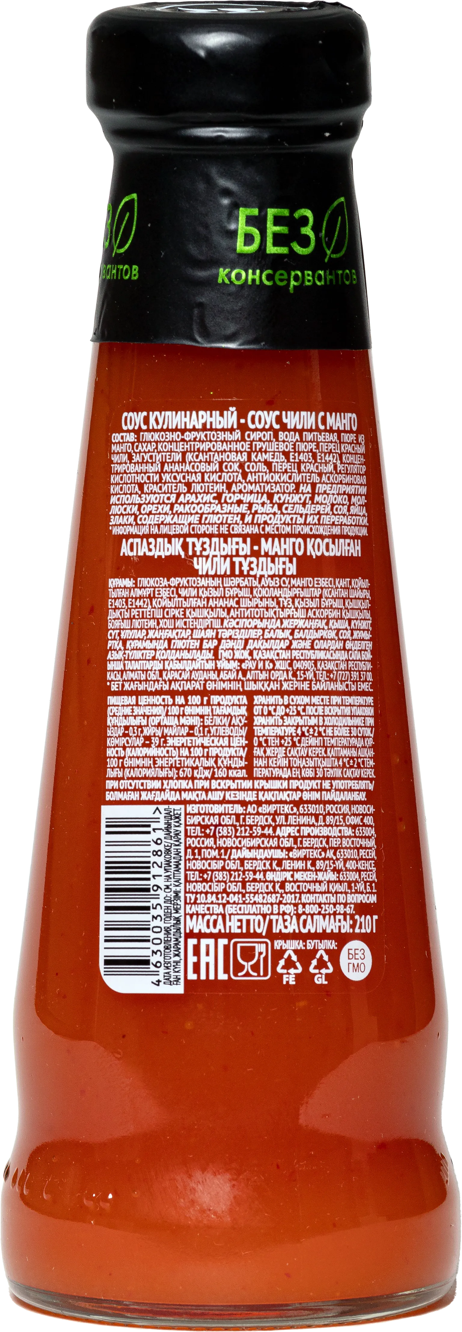сахар, концентрированное грушевое пюре, перец красный чили, загустители (ксантановая камедь, Е1403, Е1447, концентрированный ананасный сок, соль, прец красный, регулятор кислотности уксусная кислота, аскорбиновая кислота, краситель лютеин, ароматизатор. На предприятии используются арахис, горчица, кунжут, молоко, моллюски, орехи, ракообразные, рыба, сельдерей, соя, яйца, злаки, содержащие глютен и продукты их переработки.