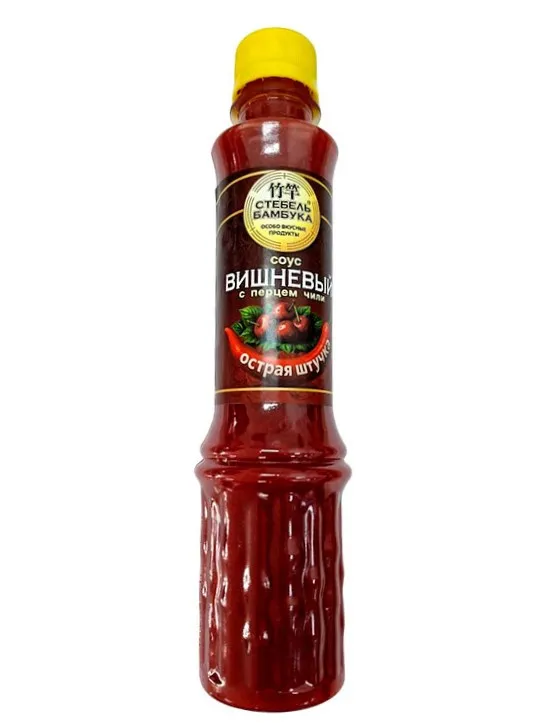 Соус вишневый с перцем чили, Стебель бамбука - уникальный соус сочетает в себе яркую кисло-сладкую вишневую ноту и пикантную остроту перца чили, рождая гармоничный баланс вкусов. Используется натуральный вишневый сок и специи, что позволяет сохранить всю палитру оригинальных оттенков.