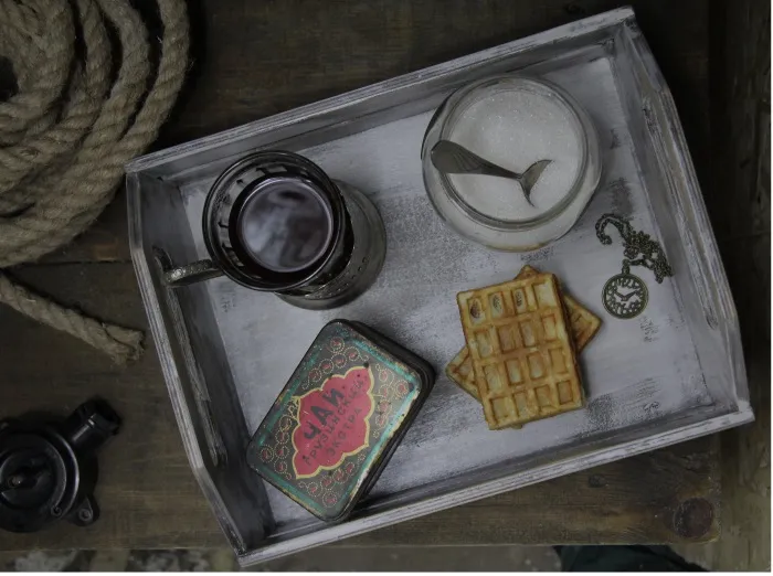 Разместила на нём турку для кофе и баночки для сахара и кофе - всё гармонично смотрится на моей кухне.
