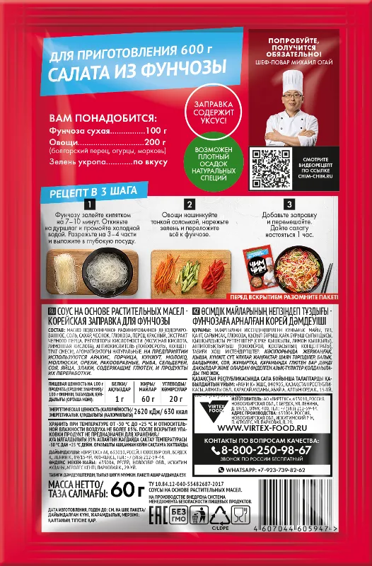 Использовать заправку Чим-Чим очень просто: отварите фунчозу, добавьте нарезанные овощи (морковь, огурец, перец) и заправьте ее готовым соусом. Для более насыщенного вкуса можно добавить немного кунжутного масла и семян кунжута.