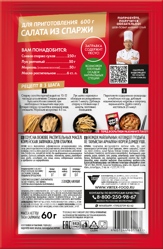 Корейская заправка для спаржи, ЧИМ-ЧИМ - уникальная заправка, созданная специально для придания классического корейского вкуса спарже. Гармоничное сочетание специй и натуральных ингредиентов обеспечивает богатую палитру вкусов: мягкость зелени обогащается легкой остротой и приятной кислинкой. Всего пара минут - и спаржа превратится в оригинальное и полезное блюдо, которое понравится каждому любителю здоровой пищи.